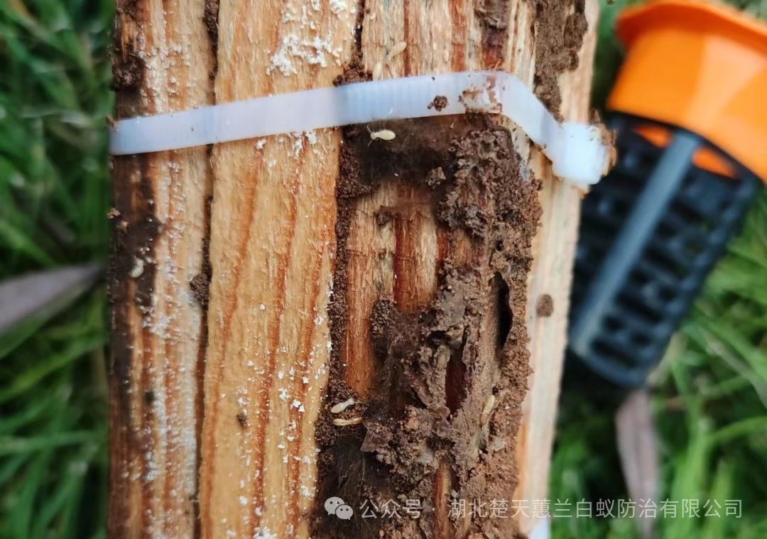通过上述方法找出白蚁活动及其外露特征并标记好,对分飞孔、泥被、泥线、白蚁喜食物、蚁巢伞等投放诱杀饵剂。